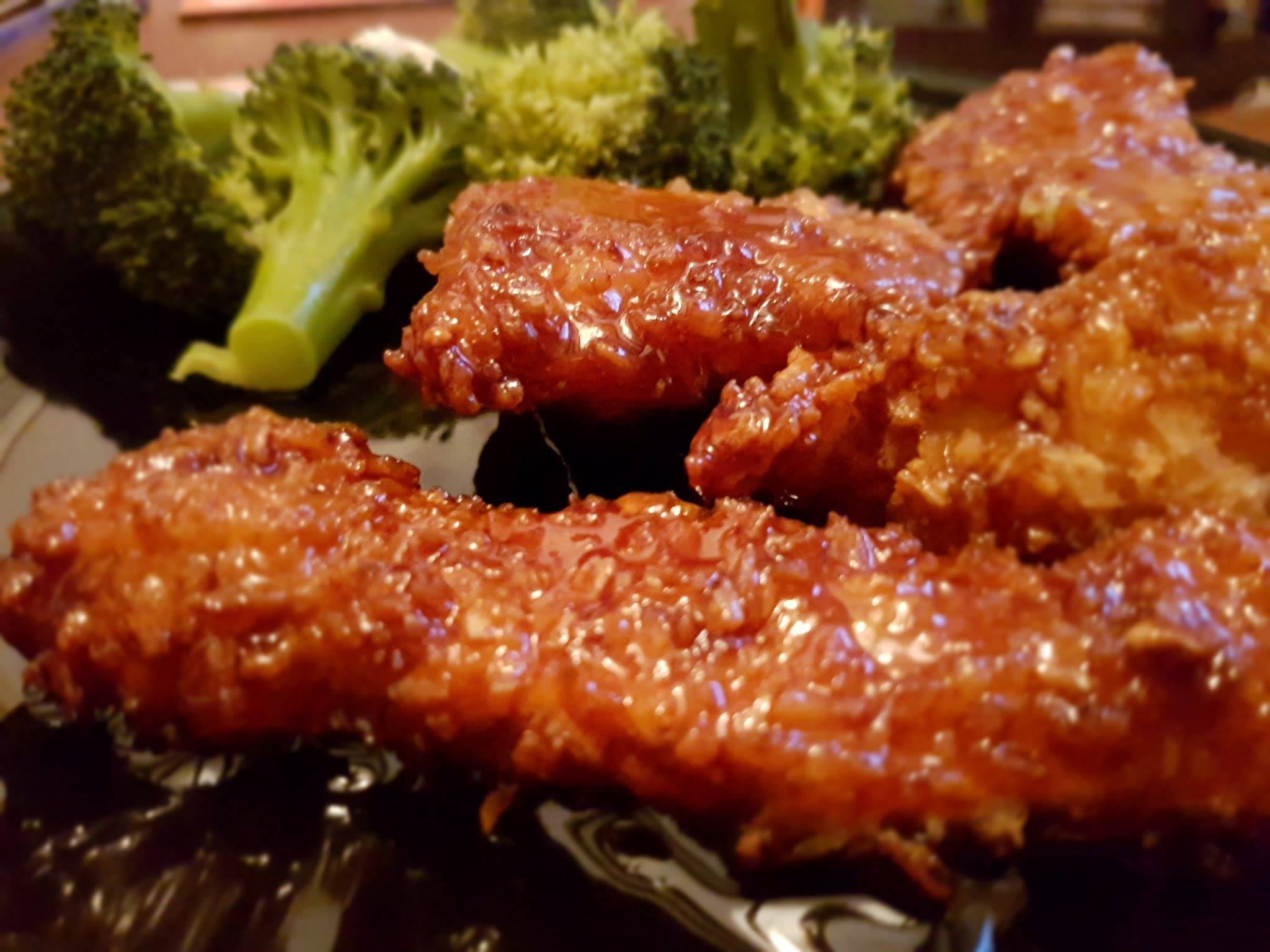 7. When chicken strips are done cooking, toss them in sauce till covered all over and serve immediately with your dipping sauce/dressing of choice.